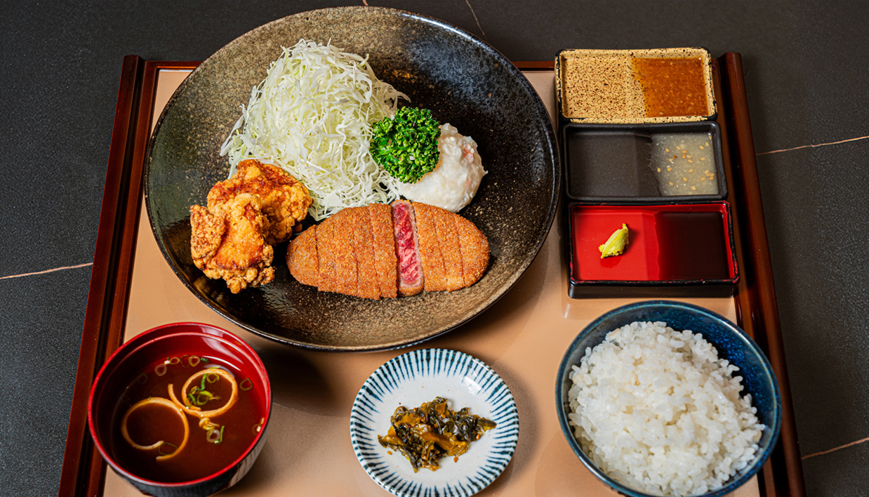 絶品の揚げたてミディアムレア牛かつ、富士山の熔岩石でお好みの焼き加減で一層香ばしく、極上の旨味を堪能。