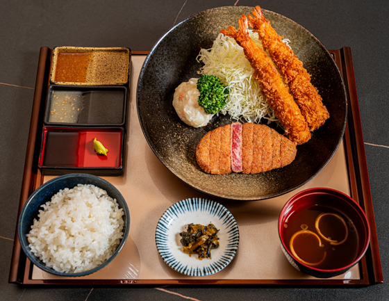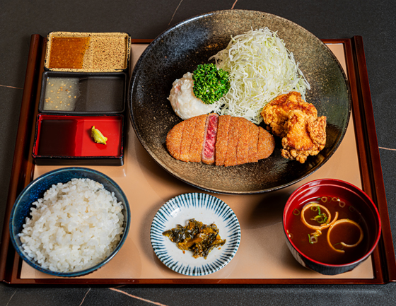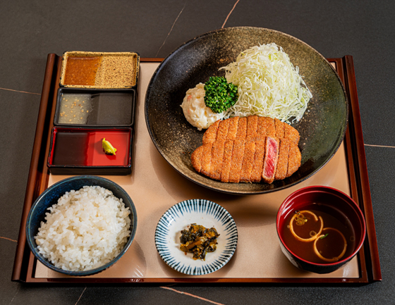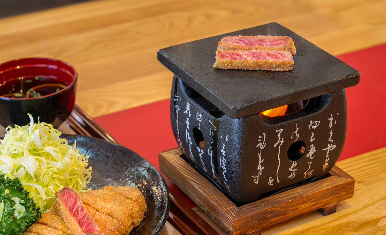 絶品の揚げたてミディアムレア牛かつ、富士山の熔岩石でお好みの焼き加減で一層香ばしく、極上の旨味を堪能。